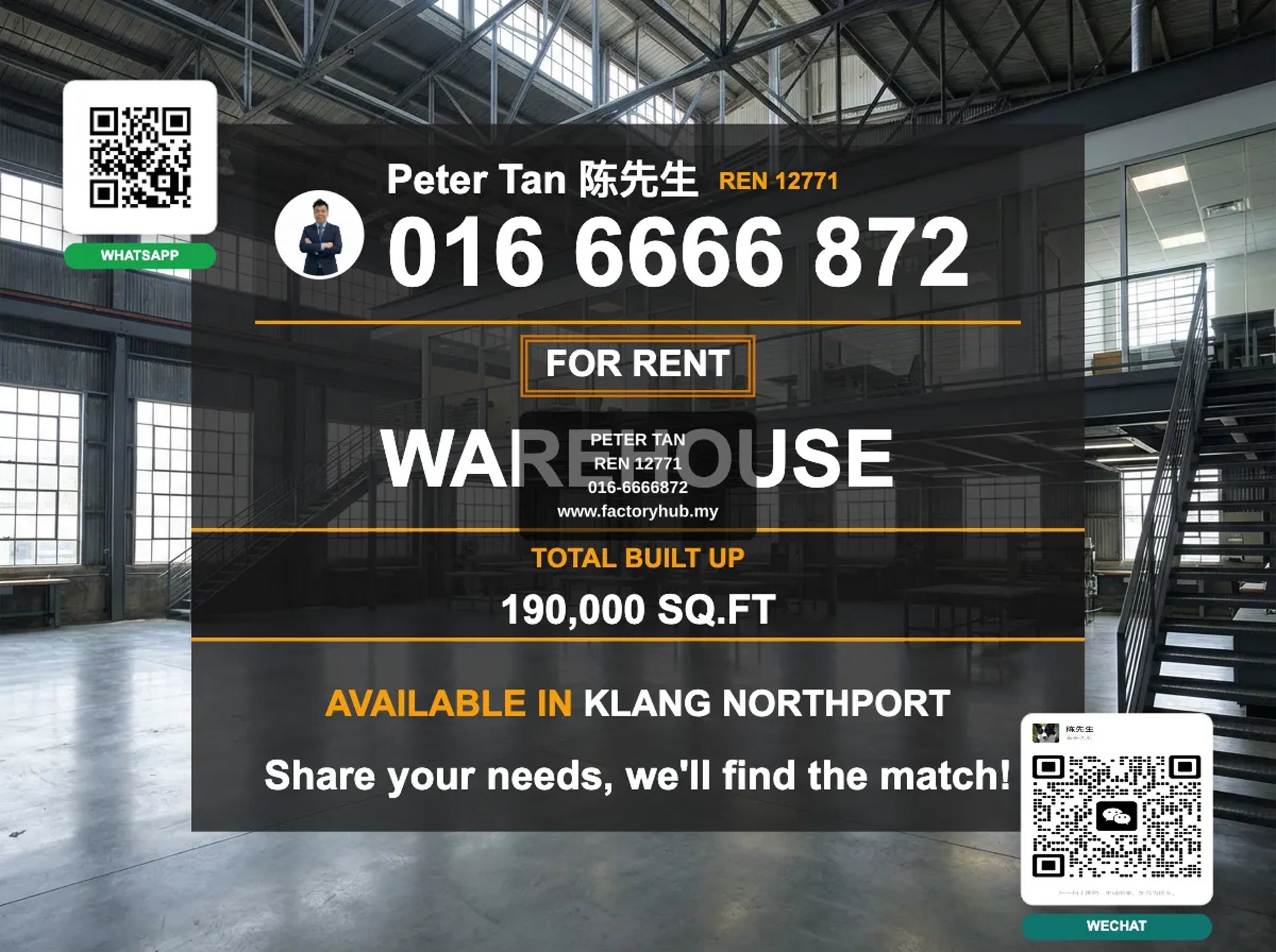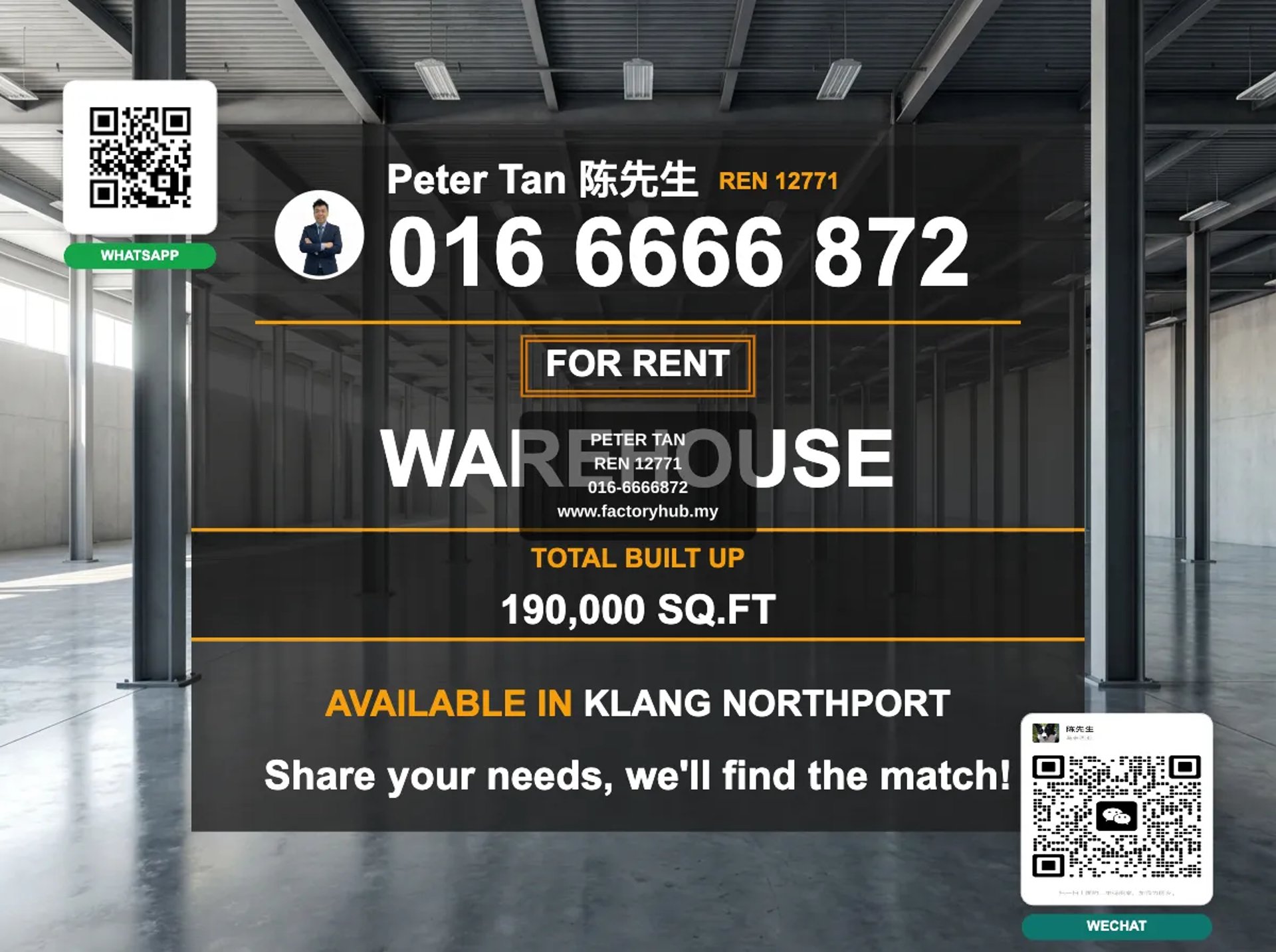 Warehouse for rent in North Port, Port Klang, Selangor. This high clearance warehouse located at Sultan Mohamed, Northport offers a large scale facility ideal for logistics, storage, and industrial operations. 6.25 acres of land with a 190,000 sqft built-up area. Monthly rental of RM 360,000.