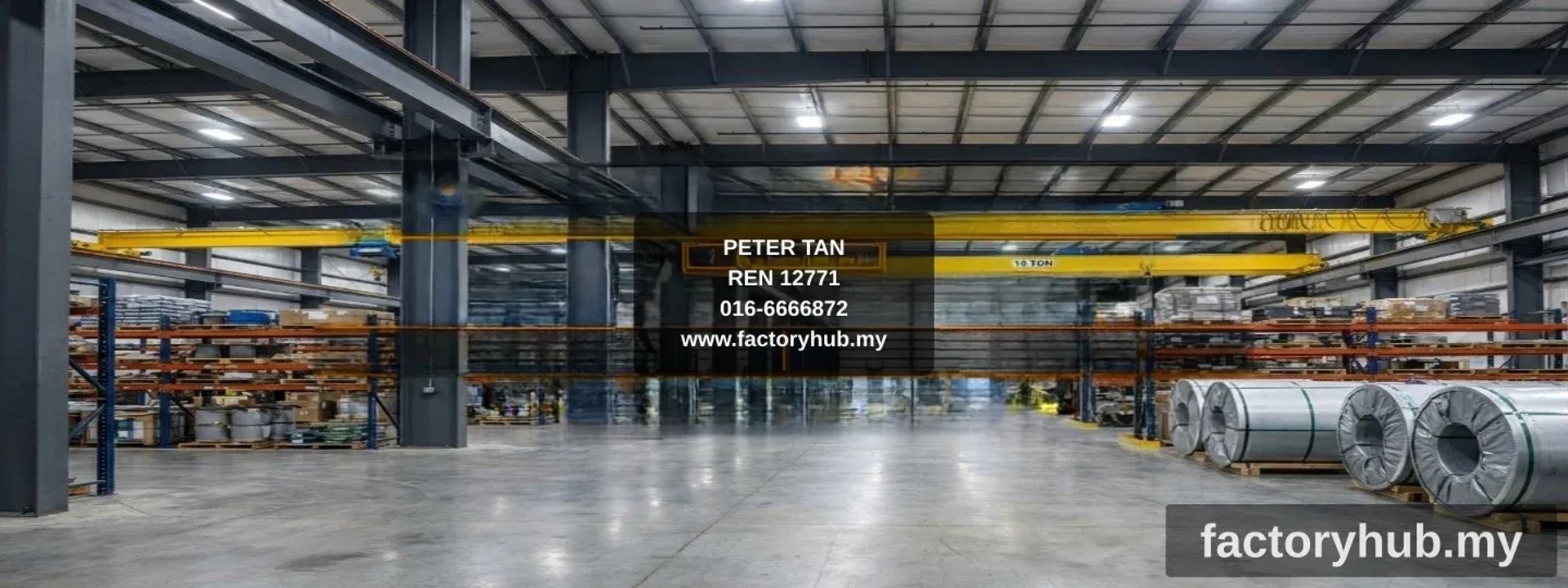 This detached factory warehouse provides a massive operational footprint ideal for heavy-duty applications. The facility comes with a comprehensive overhead crane system (5T, 10T, 20T) installed, eliminating the need for additional infrastructure investment. The warehouse offers high-clearance space suitable for large equipment and storage racks.